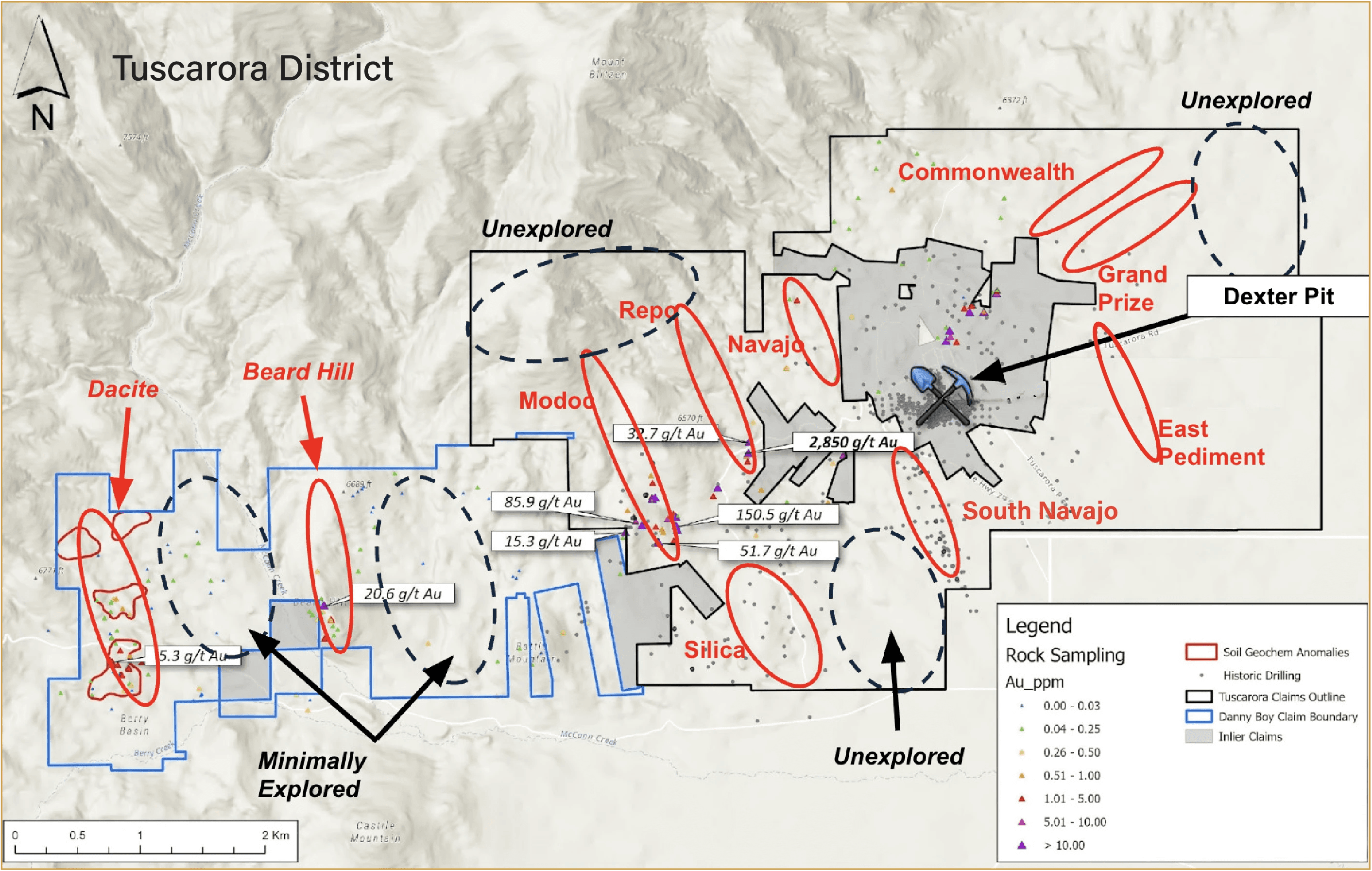 This represents the strongest phase of gold mineralization known in the Basin and Range Province. Historically, production from placers, quartz veins and stockwork in the district exceeded 500,000 ounces of gold and 7.5 million ounces of silver, establishing it as one of Nevada’s classic high-grade epithermal districts.